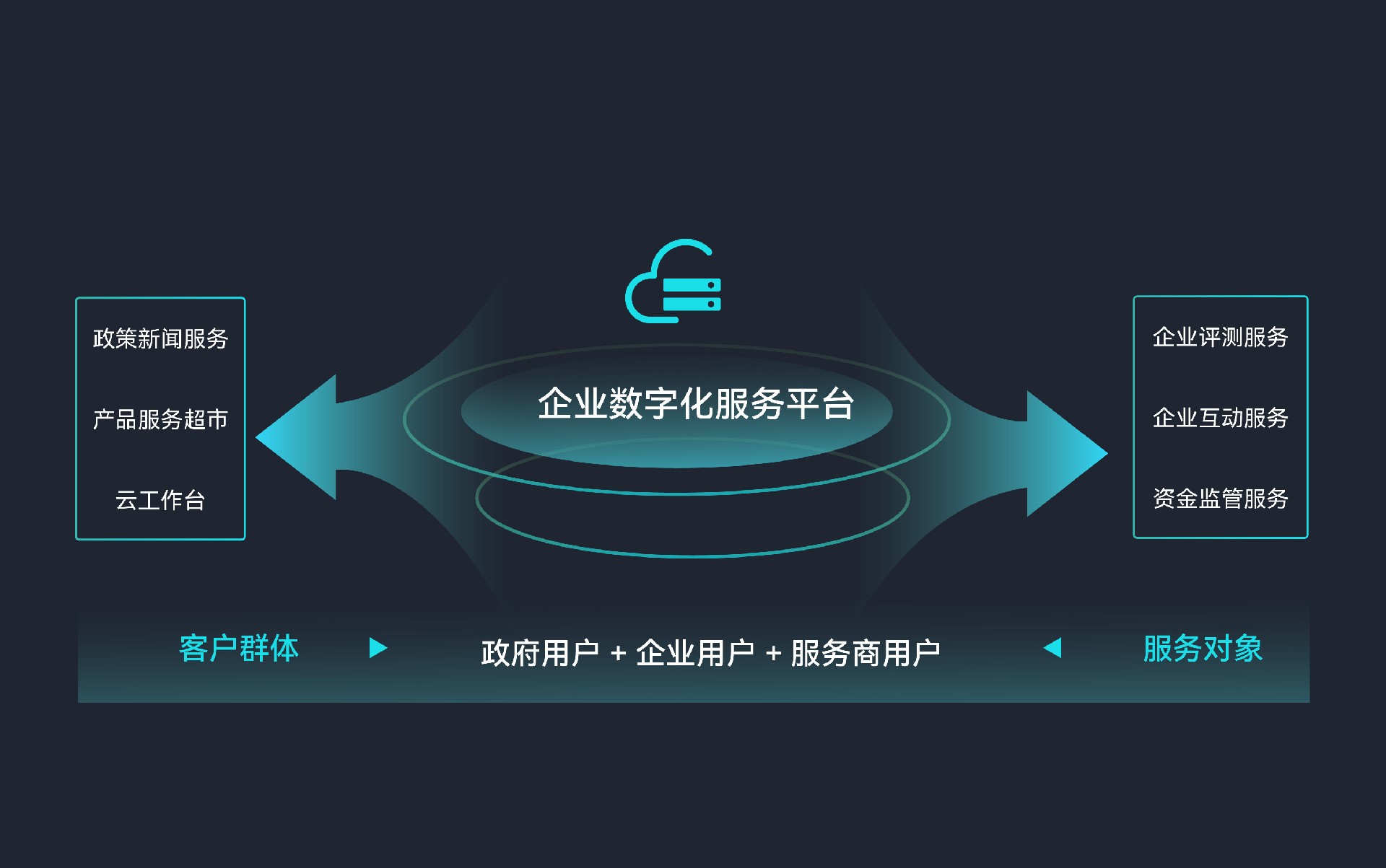 企业数字化服务平台是一款可覆盖政府机构、街道园区及商业综合体在数字化转型工作中的重要平台级产品。平台通过提供 政策新闻、企业数字化评测、服务商城、政企互动及个人中心等功能,将政府机构、园区街道、产品服务提供商、中小企业 有机结合,实现各方价值诉求,提高企业数字化水平,加强政府与企业之间的互动,推进区域经济高质量发展。
